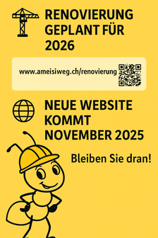 Beim Start des Ameisiwäg wird gebaut. Wir haben den Wegweiser entfernt, der Weg ist aber offen. Geht durch die Baustelle durch, der Wegstart liegt etwa hundert Meter weiter hinten bei der ersten Scheune. Viel Vergnügen!